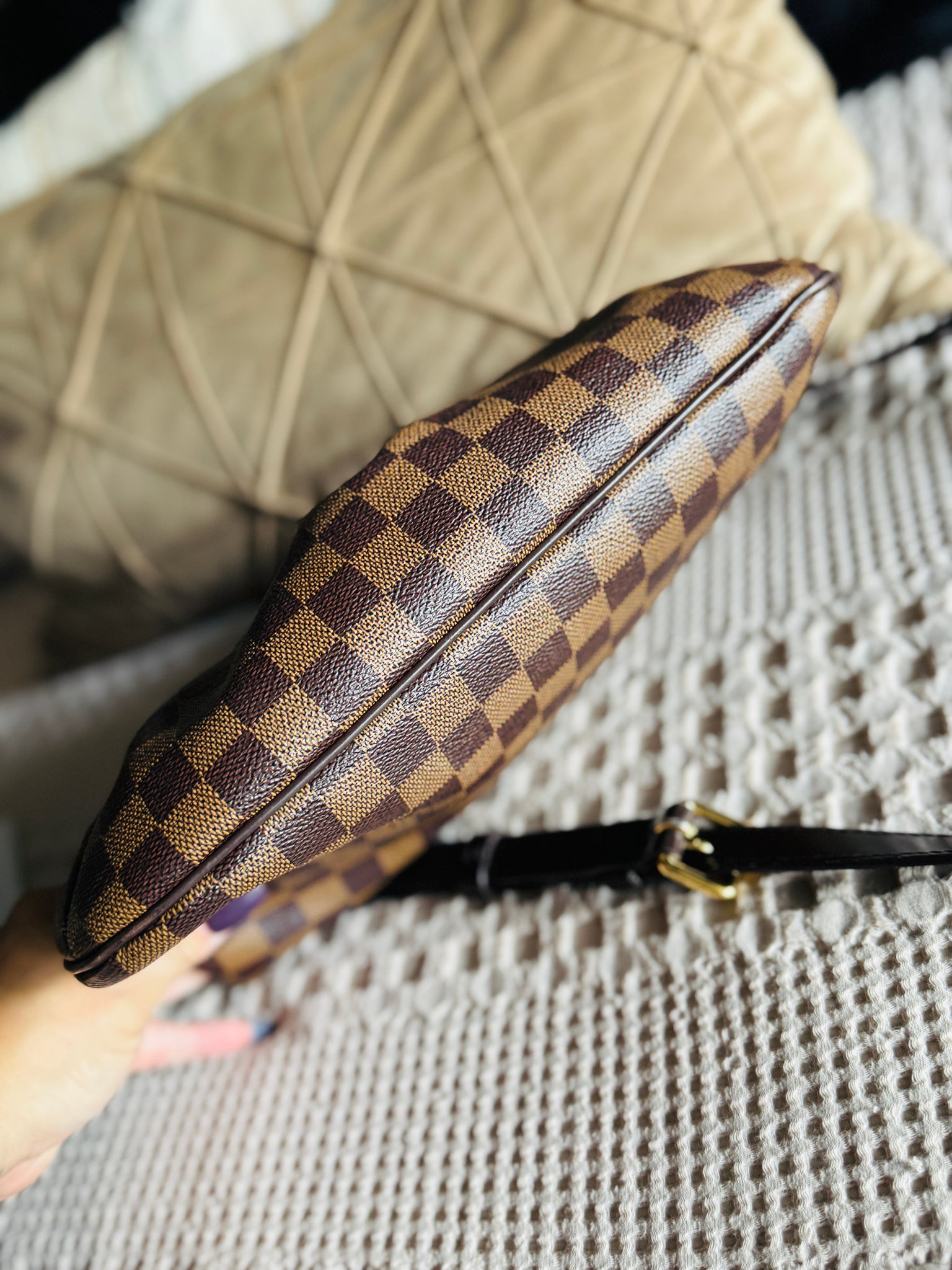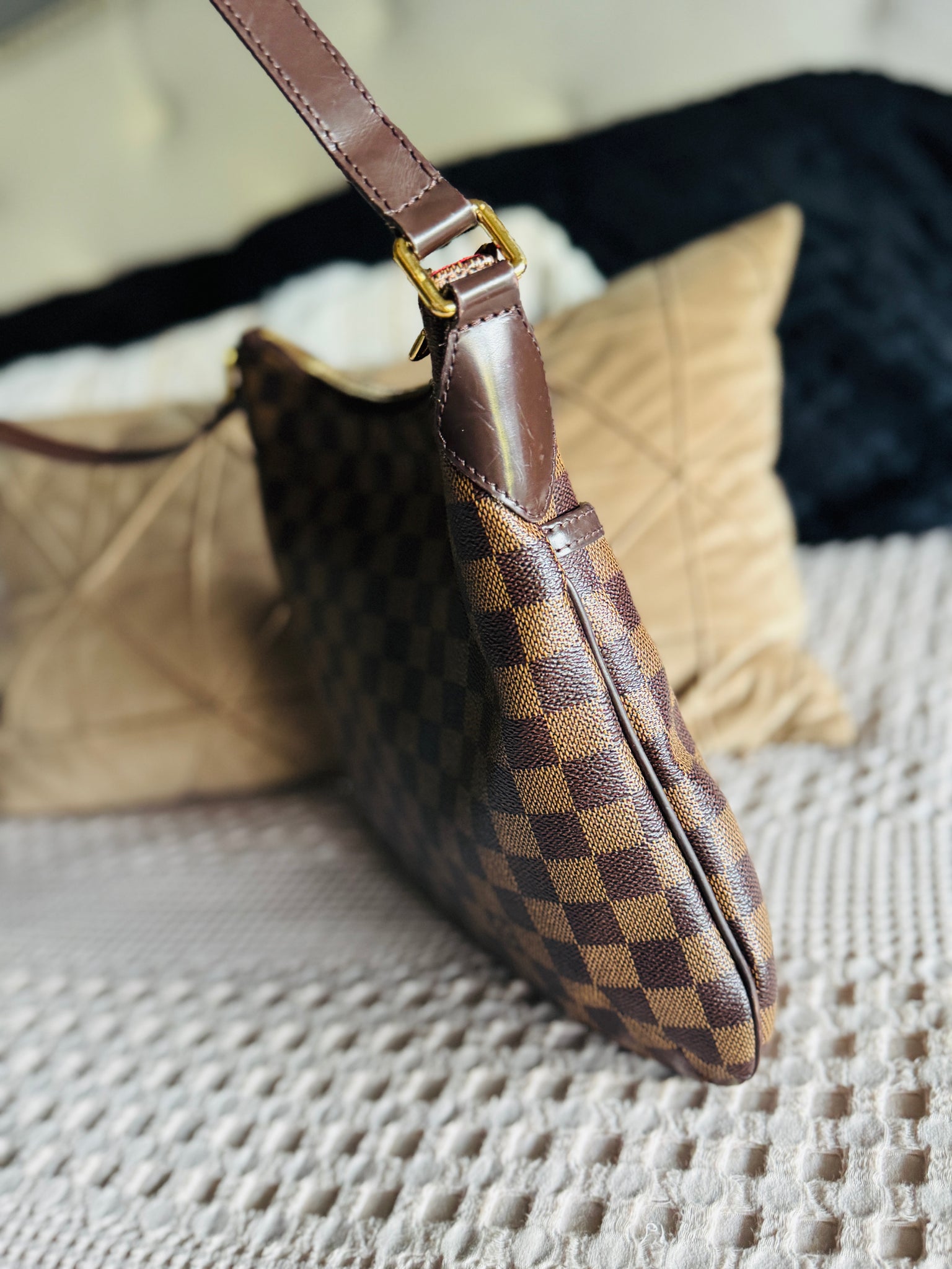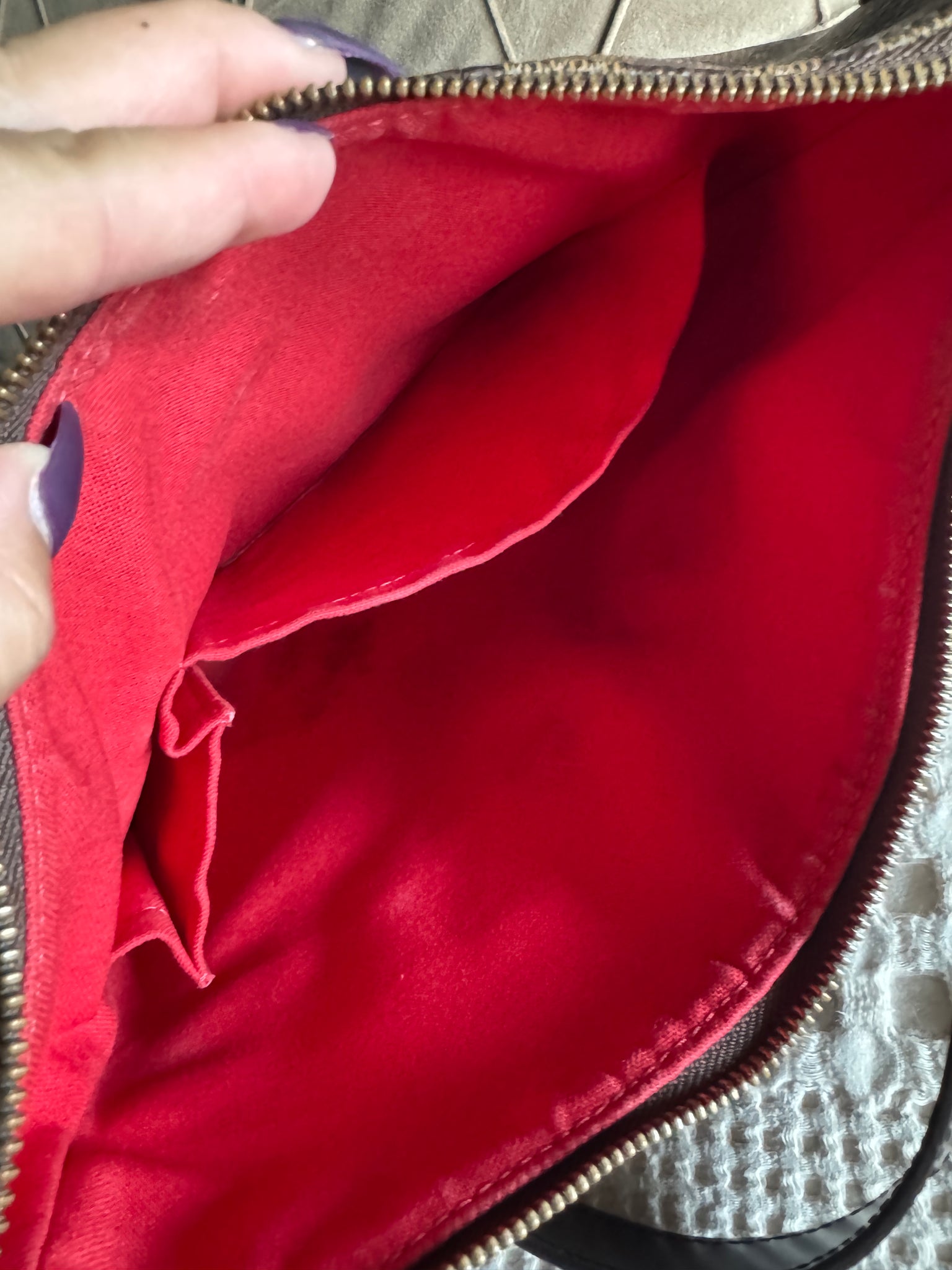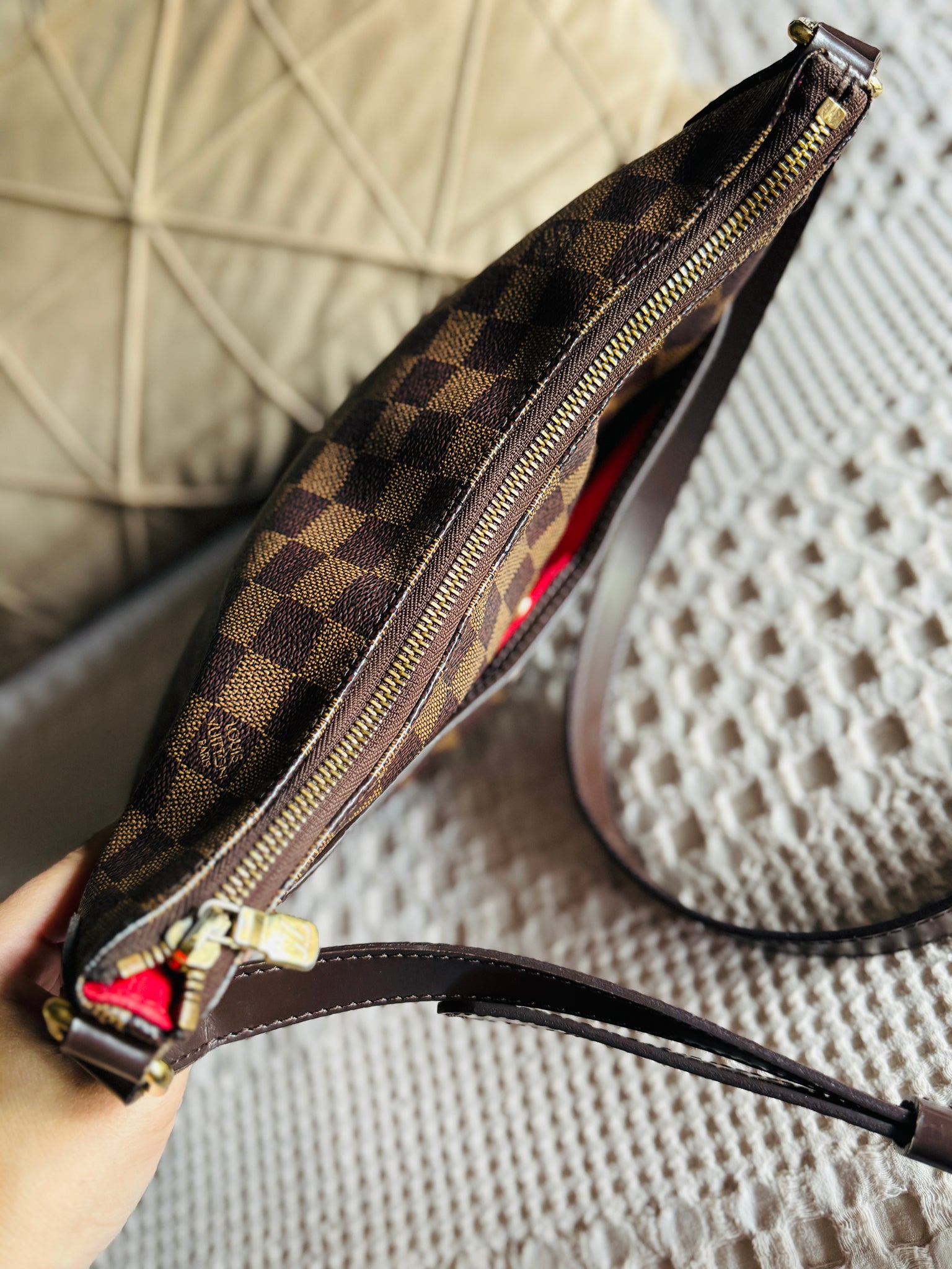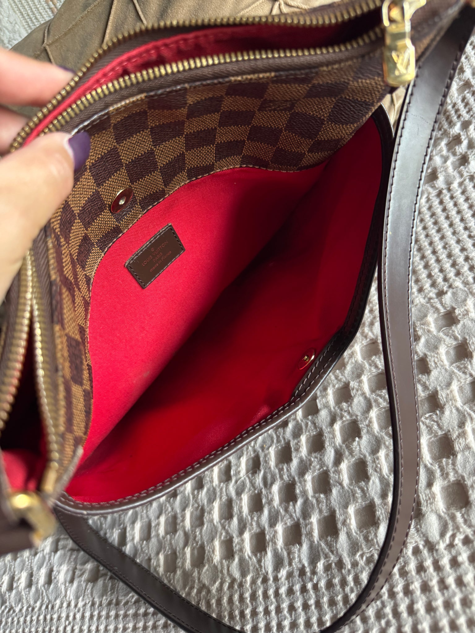 authentic damier ebene Bloomsbury crossbody with thick, adjustable strap - this beauty is in good shape! the red interior is spacious with a few side pockets and one large pocket exterior. The Zipper slides well. interior has some marks/discoloration. Absolutely no peeling or stickiness.Piping is intact. Small hairlines at zipper line (pictured) if you can’t see them that’s how small they are. Reflected in price. No peeling or stickiness. No color transfer. Pet/smoke free.