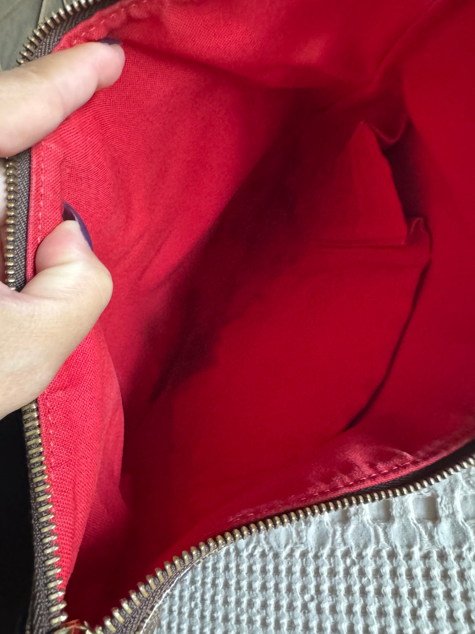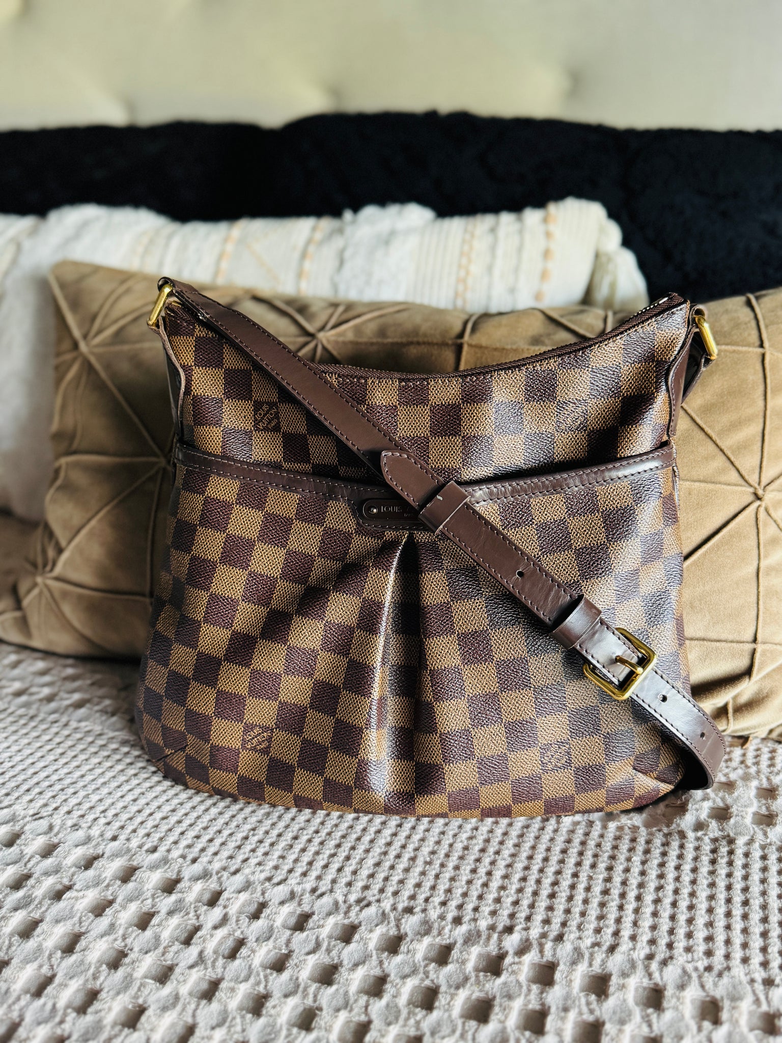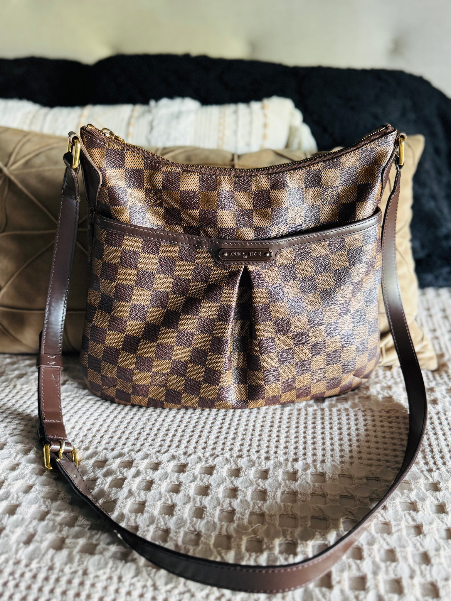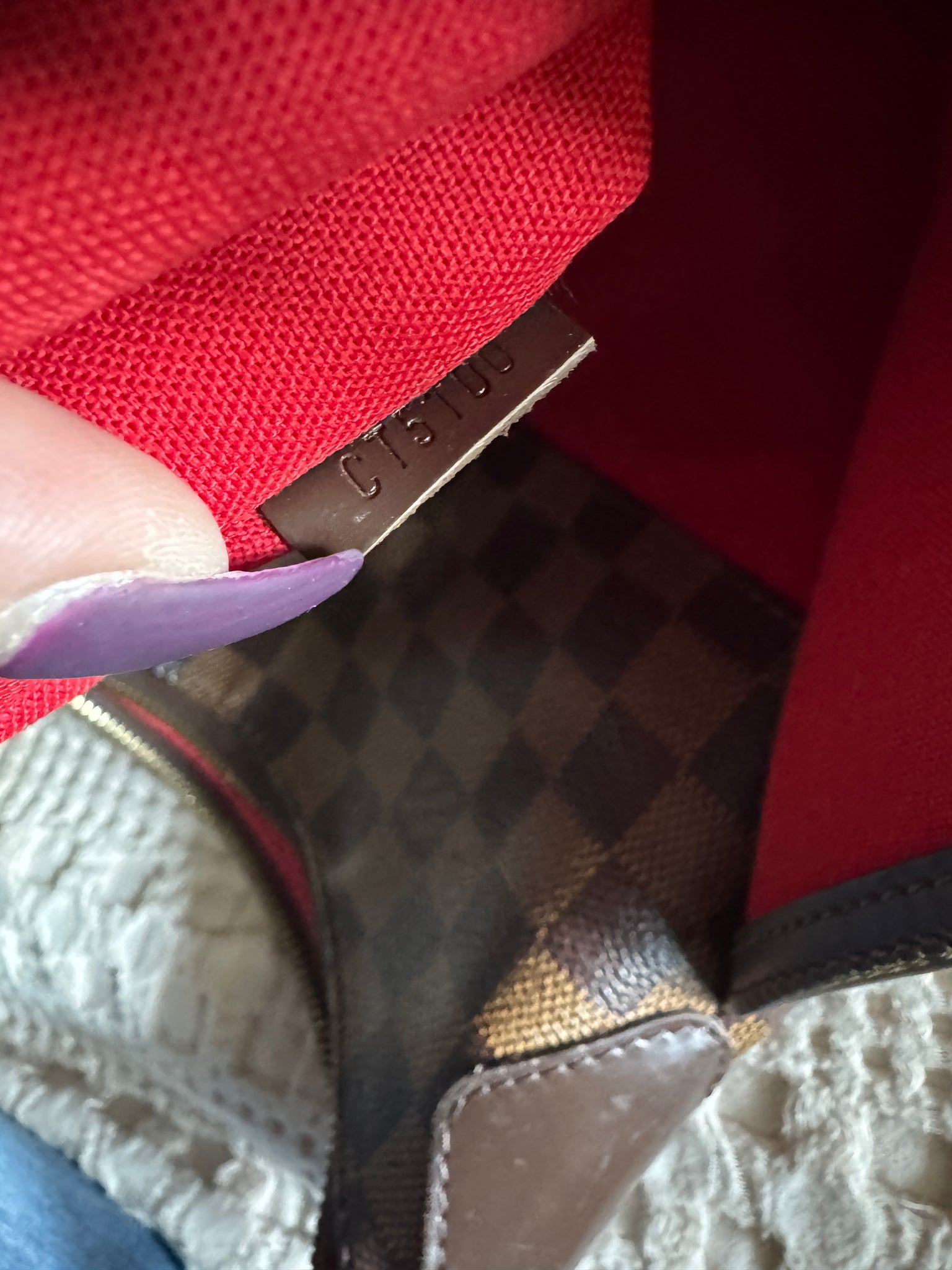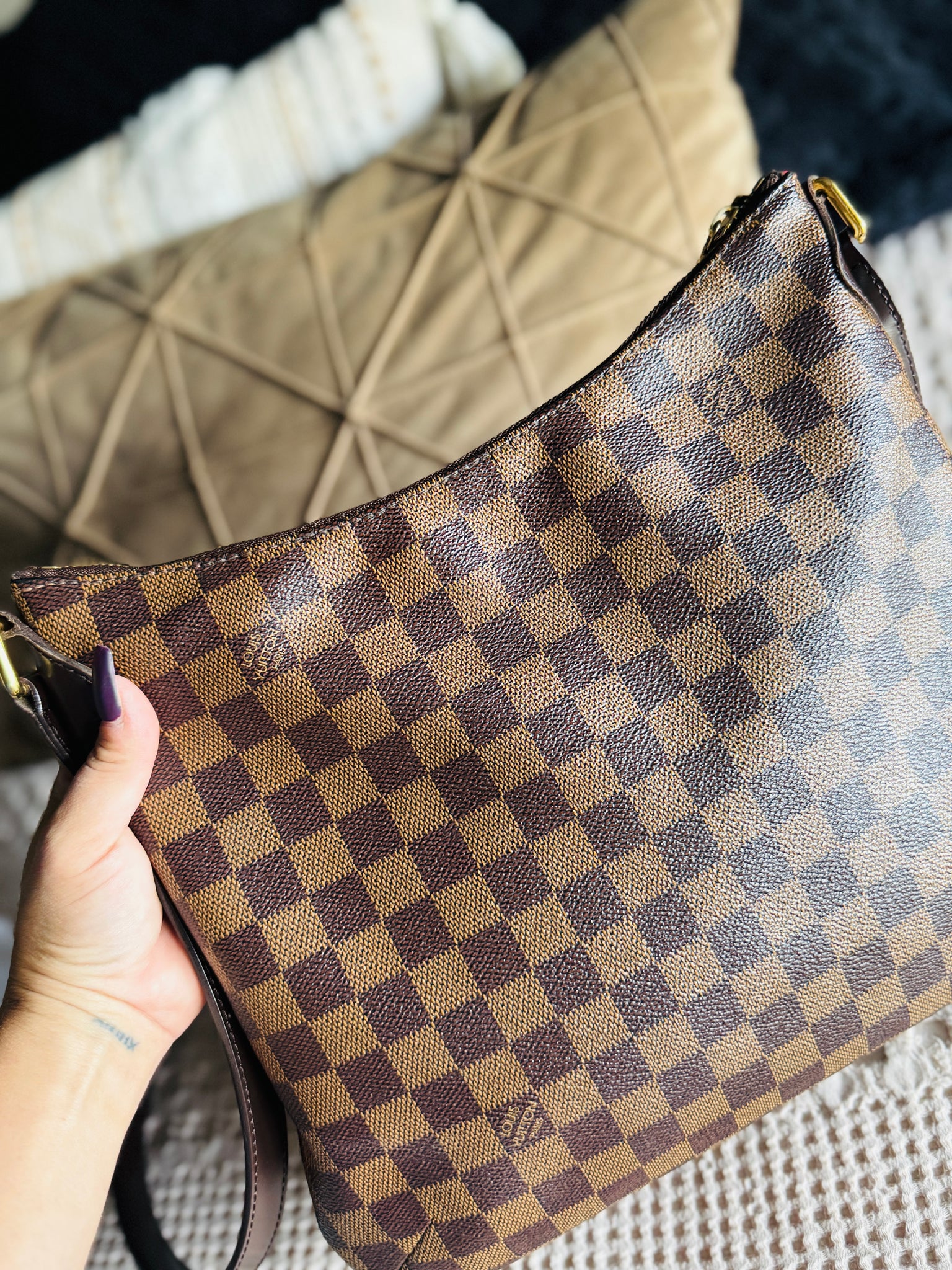 authentic damier ebene Bloomsbury crossbody with thick, adjustable strap - this beauty is in good shape! the red interior is spacious with a few side pockets and one large pocket exterior. The Zipper slides well. interior has some marks/discoloration. Absolutely no peeling or stickiness.Piping is intact. Small hairlines at zipper line (pictured) if you can’t see them that’s how small they are. Reflected in price. No peeling or stickiness. No color transfer. Pet/smoke free.