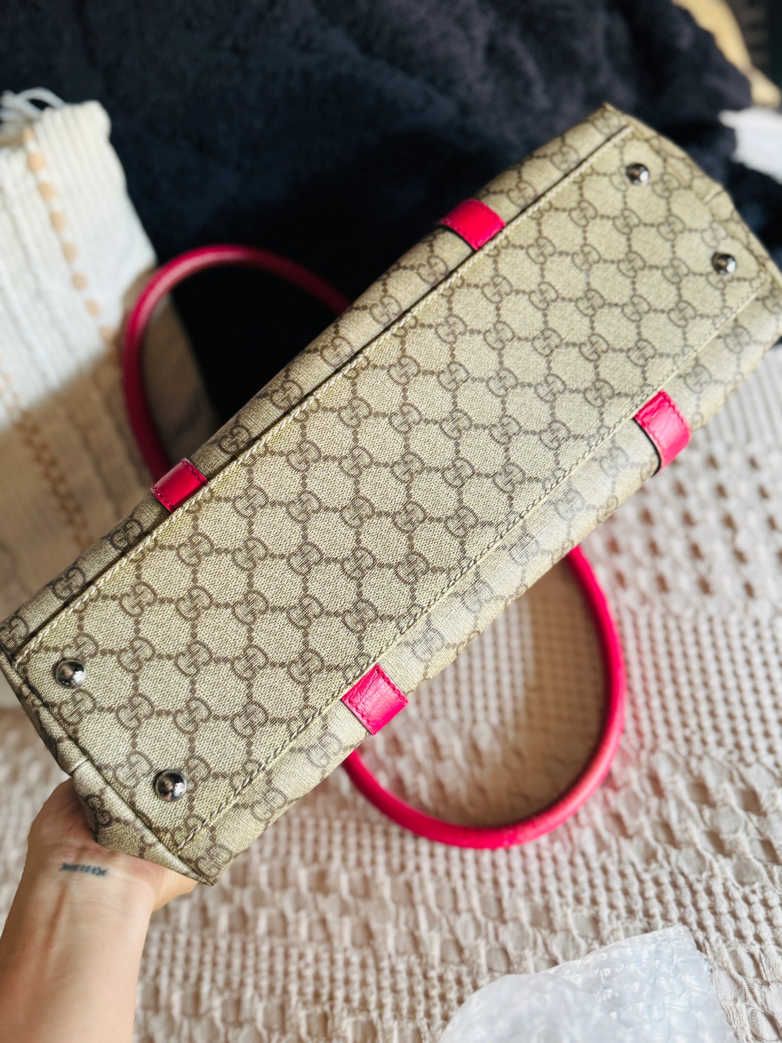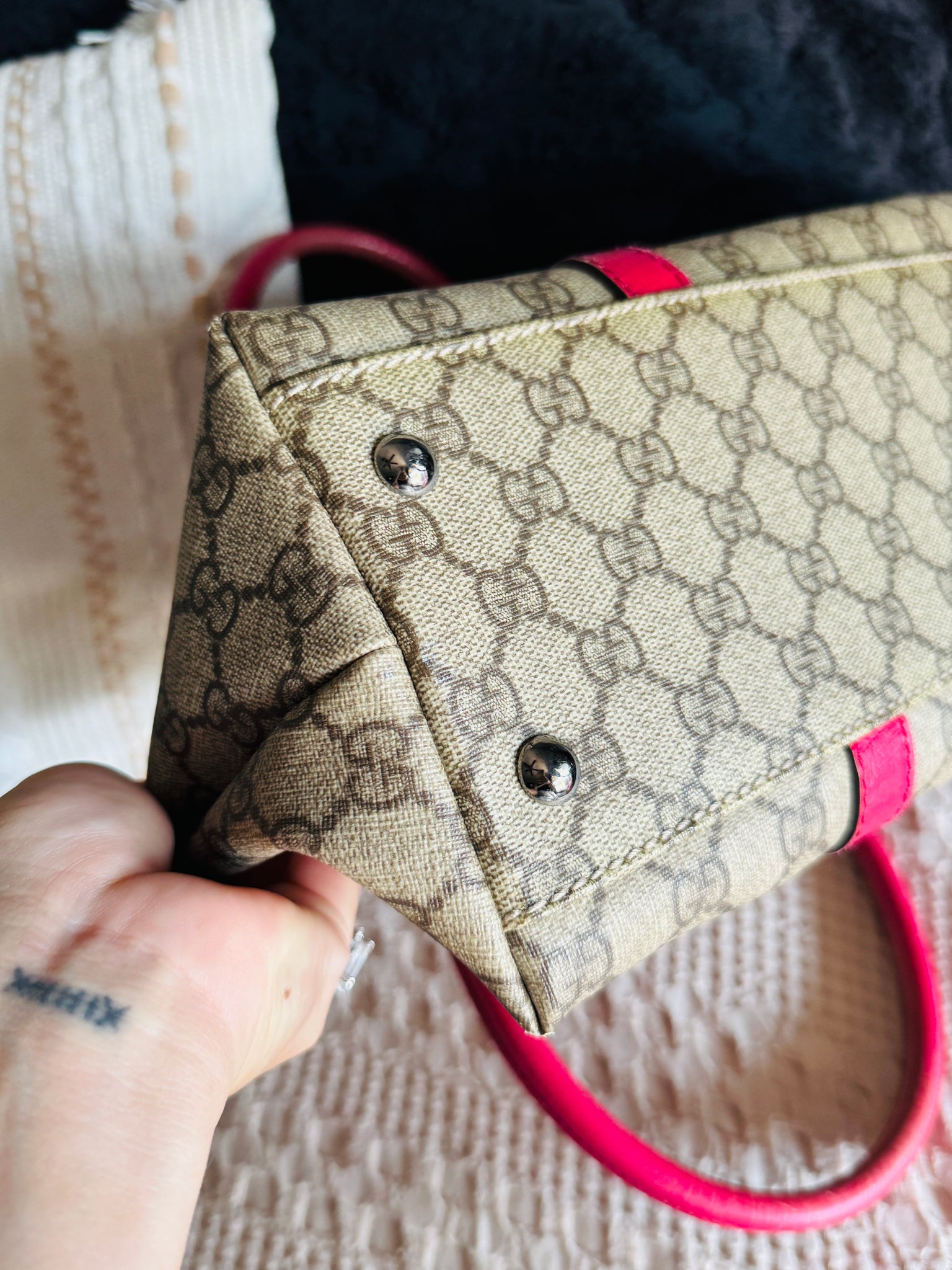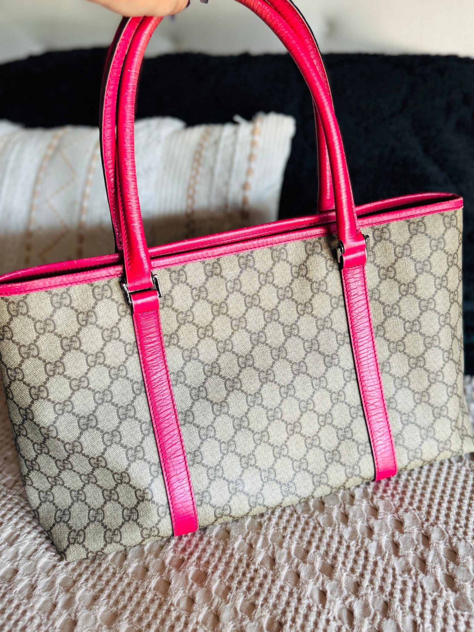 Authentic Gucci tote with pink trim - This beauty is in excellent condition, clean inside and out. Thick straps with solid chaps and magnetic snap enclosure. Interior is roomy and clean with one pocket. I’ve only had this pattern one other time and it sold the same day - Don’t see too many of these! Has some minor fading on handles and trim from normal years. Corners have rubs from normal use. Gorgeous bag for an excellent price! Pet/smoke free.