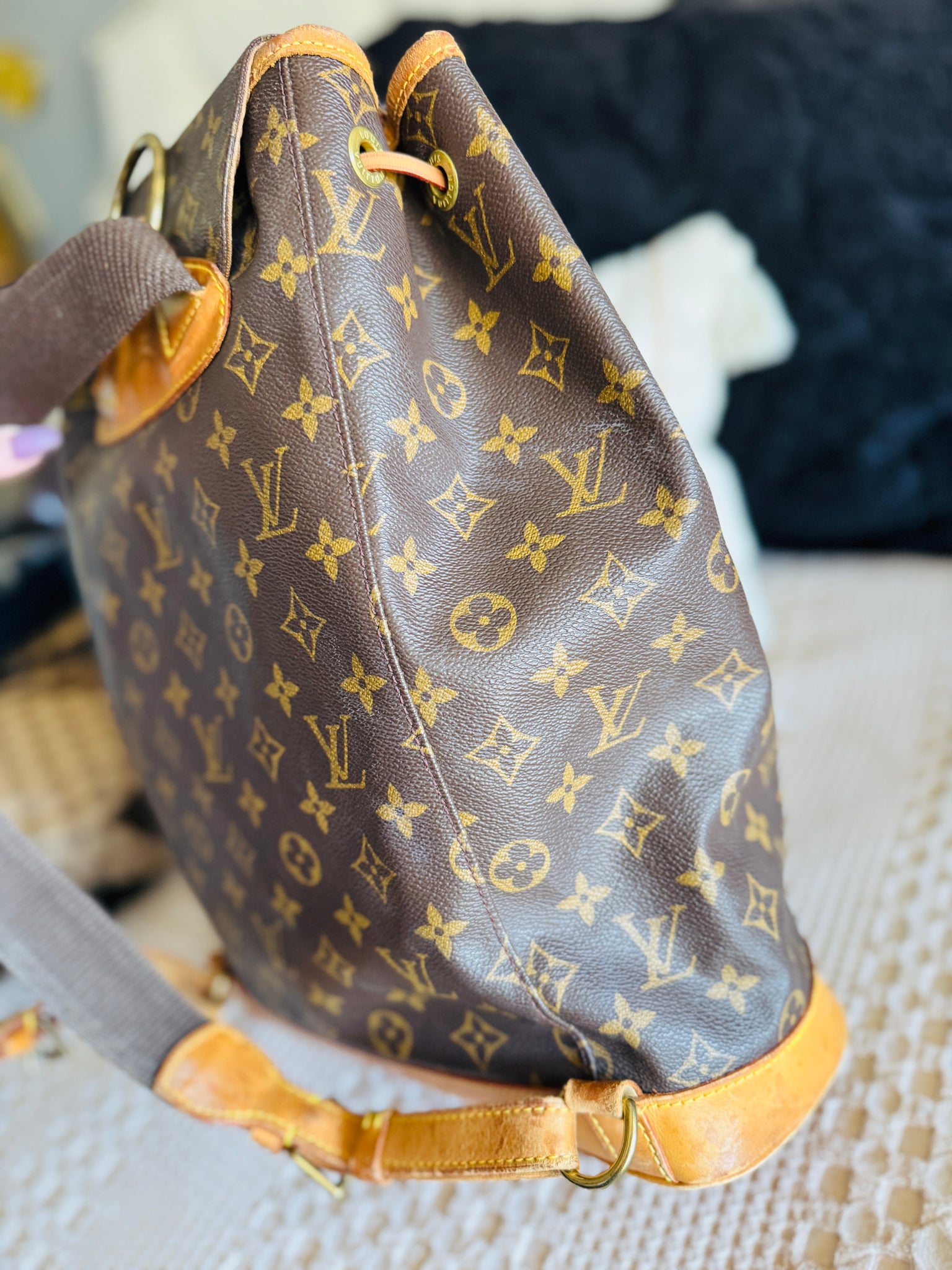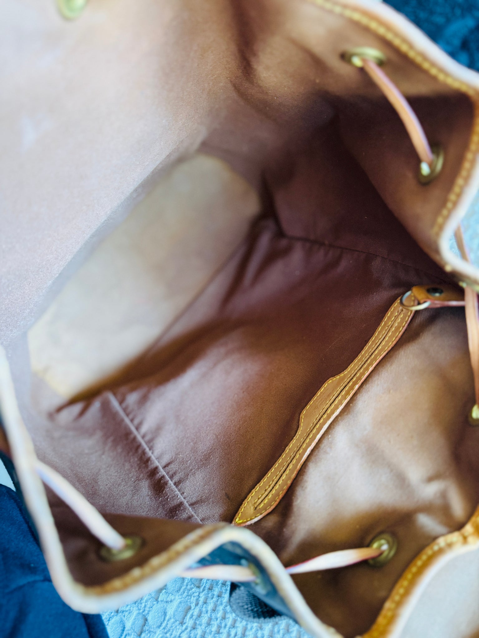 The canvas is vibrant and the interior is clean! The zippers slide as they should. No peeling or stickiness. Vachetta has a lovely golden patina with faint water marks and minor dryness. Trim and drawstring string have creasing /dryness. Normal wear for this bag. ABSOLUTELY GORGEOUS 🖤Pet/smoke free.