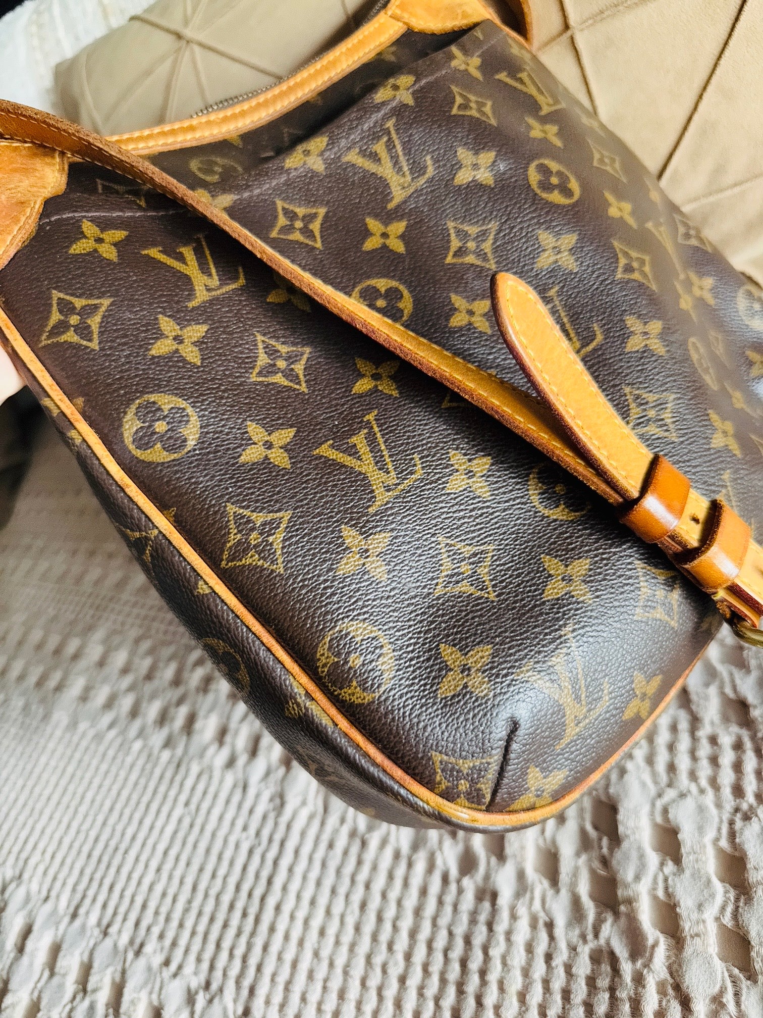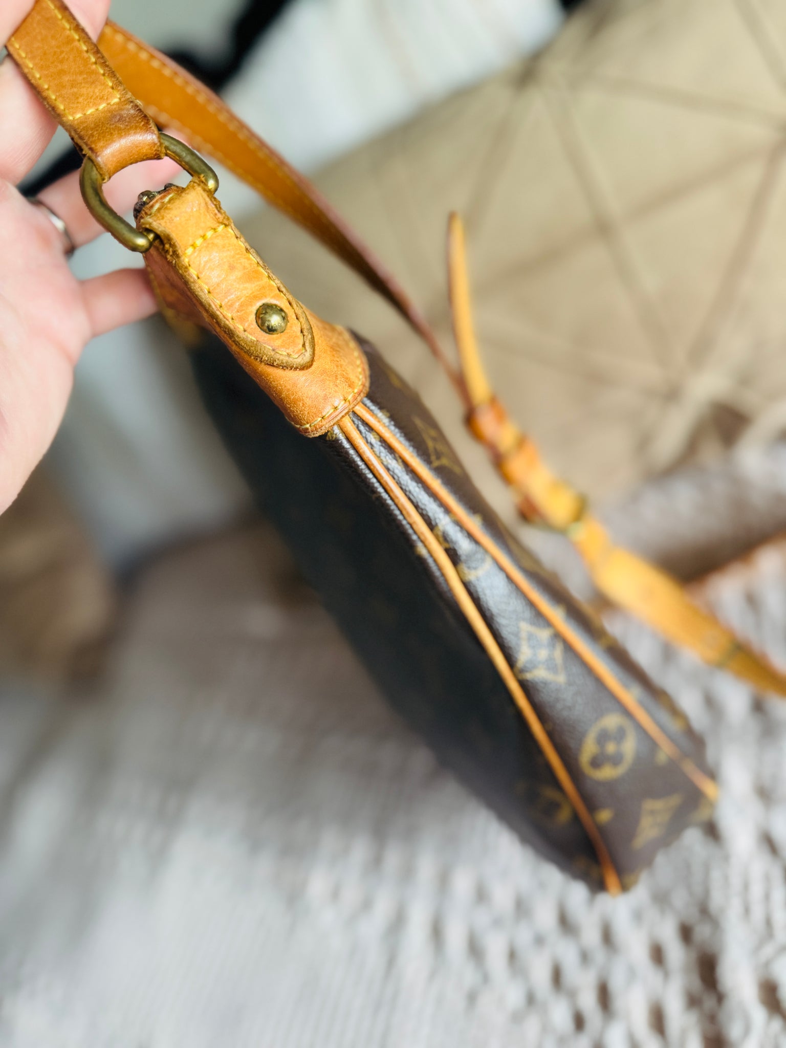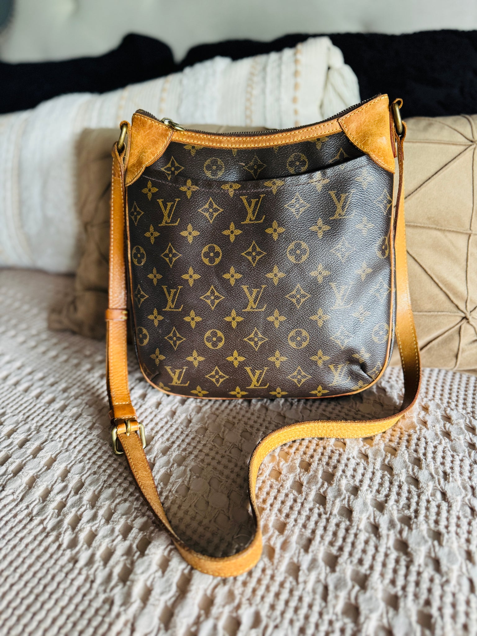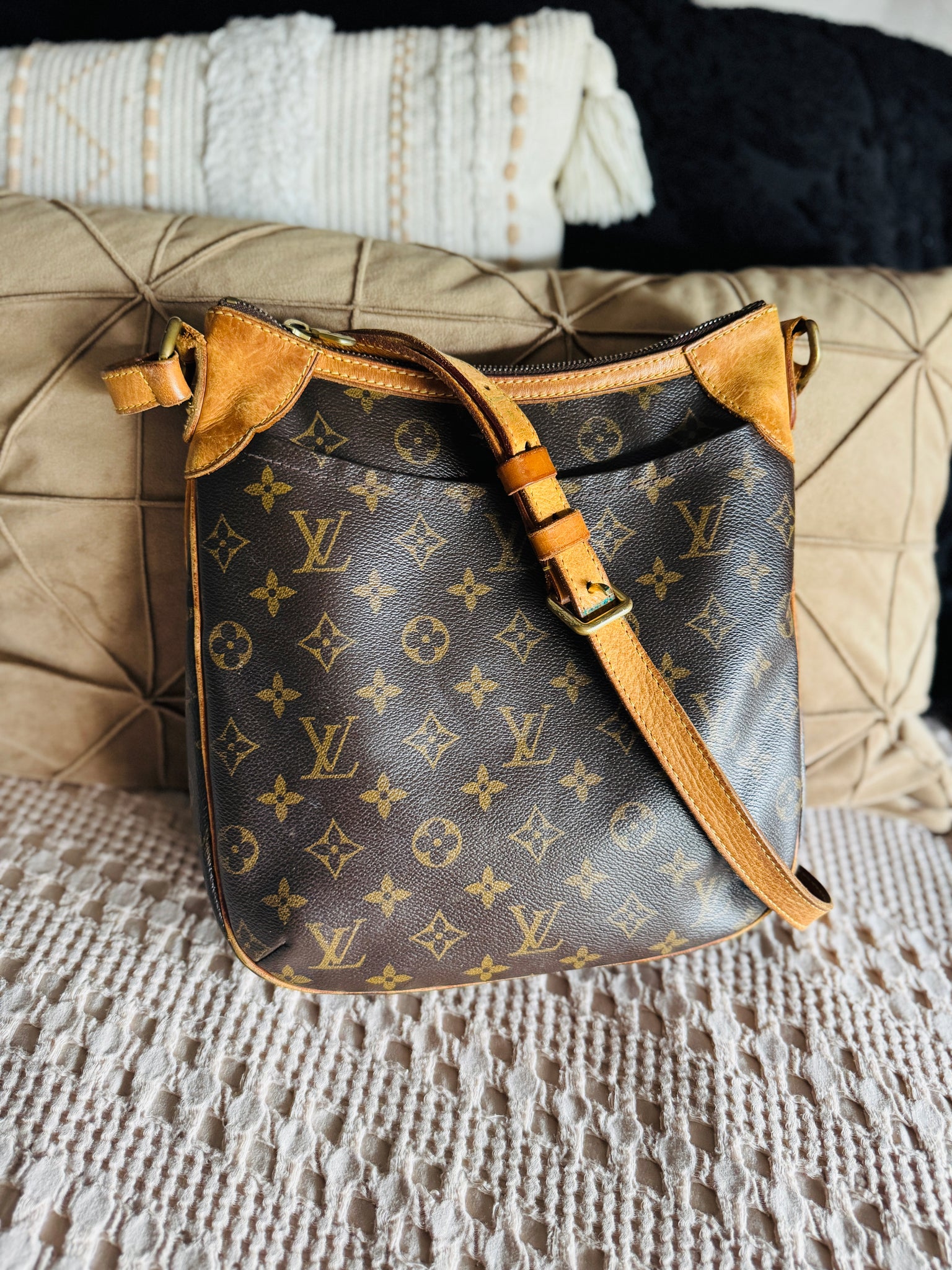 Authentic monogram Odeon PM in good condition. Vibrant canvas, medium dark patina. Strap is thick and adjustable. Interior is spacious and clean with two side pockets. Exterior has one large slip pocket. No peeling or stickiness. Vachetta has water marks, creases from