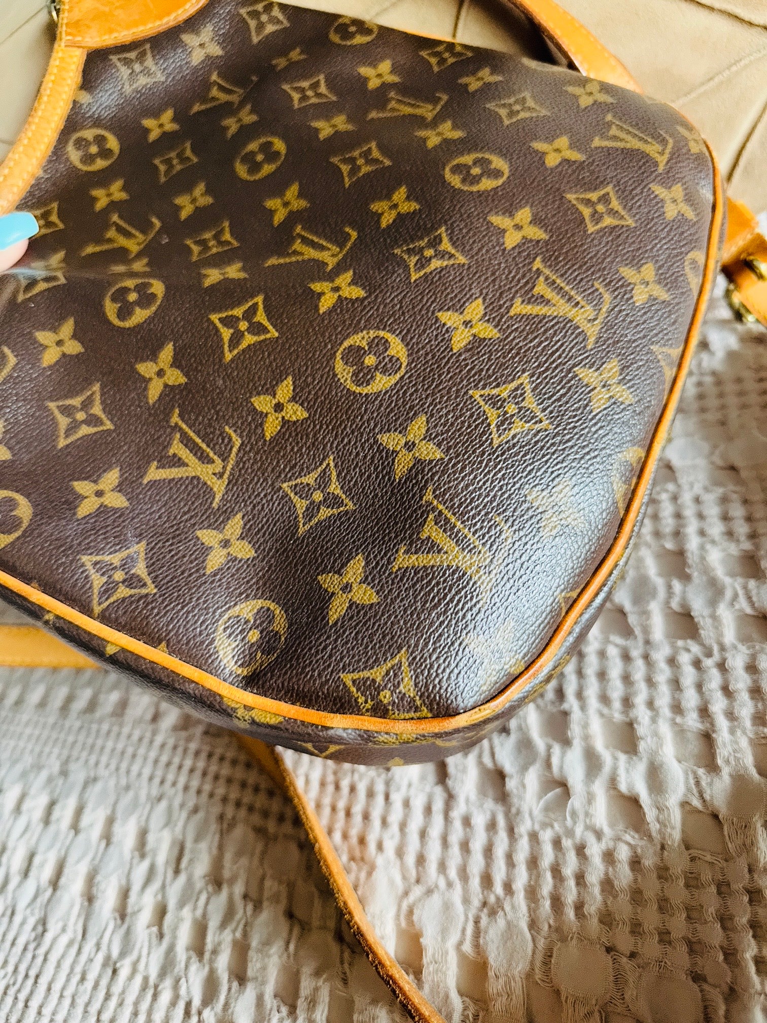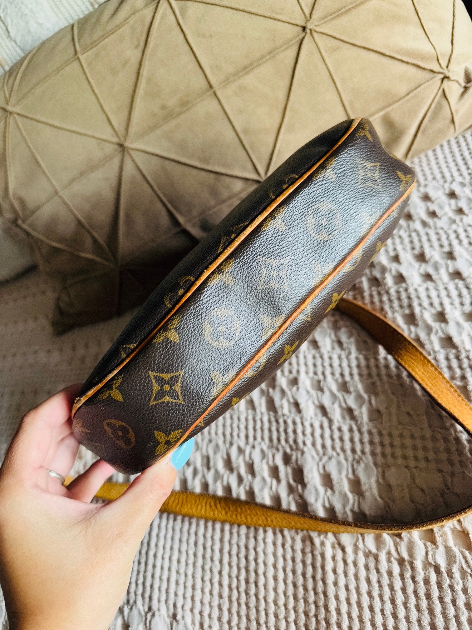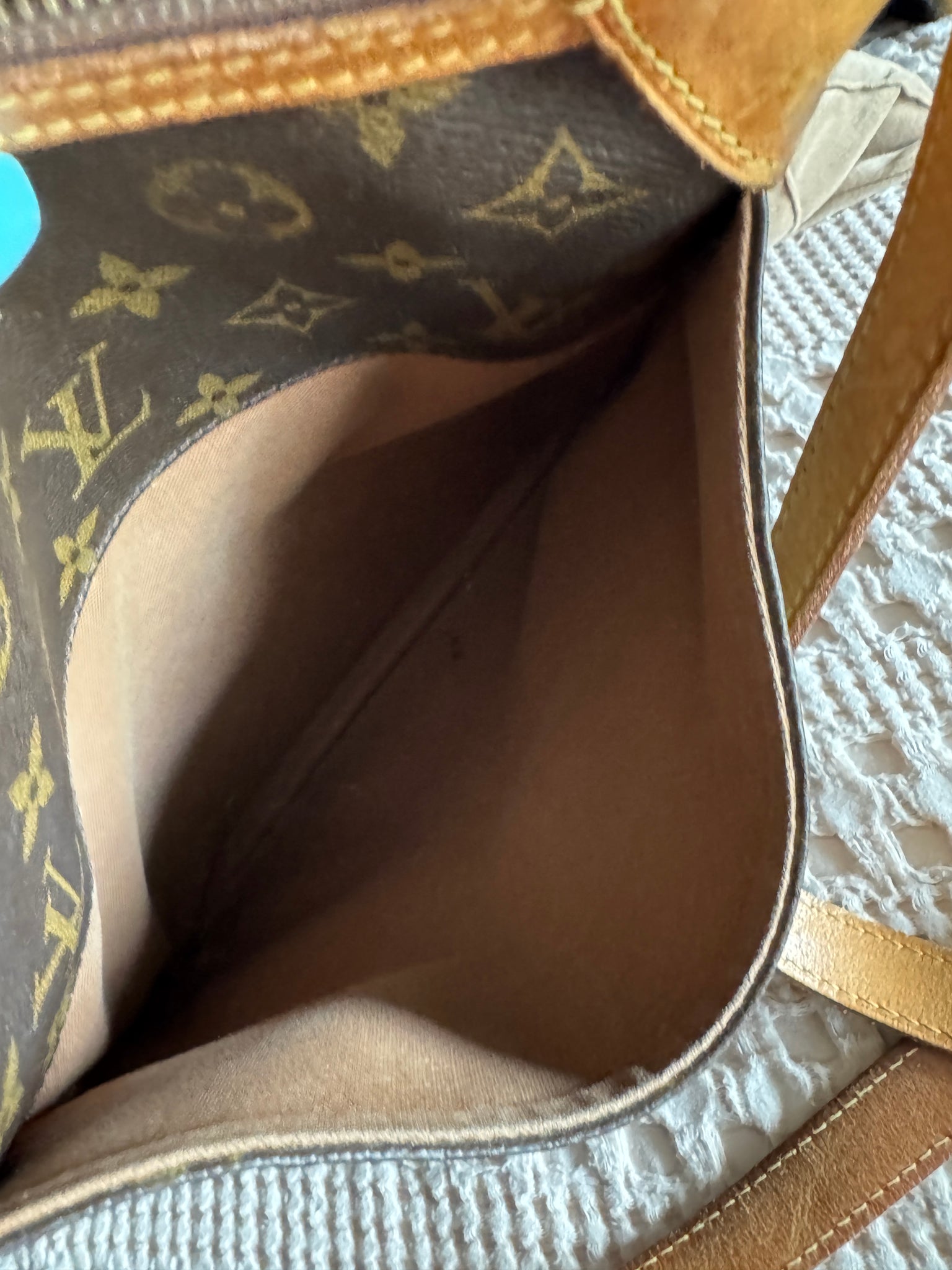 Authentic monogram Odeon PM in good condition. Vibrant canvas, medium dark patina. Strap is thick and adjustable. Interior is spacious and clean with two side pockets. Exterior has one large slip pocket. No peeling or stickiness. Vachetta has water marks, creases from