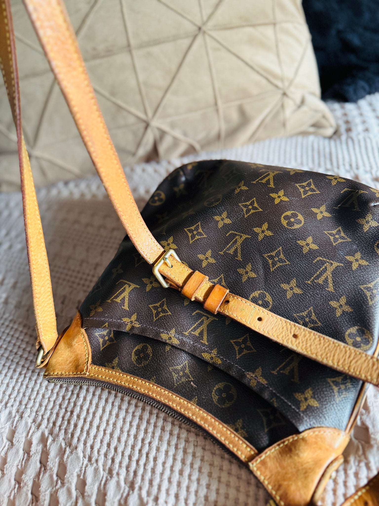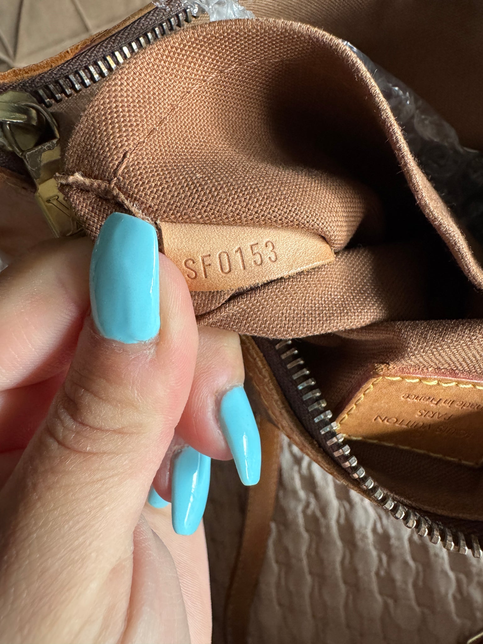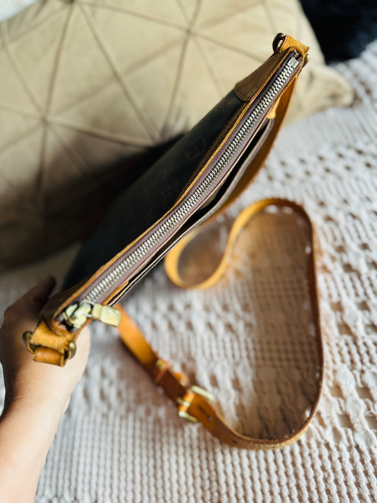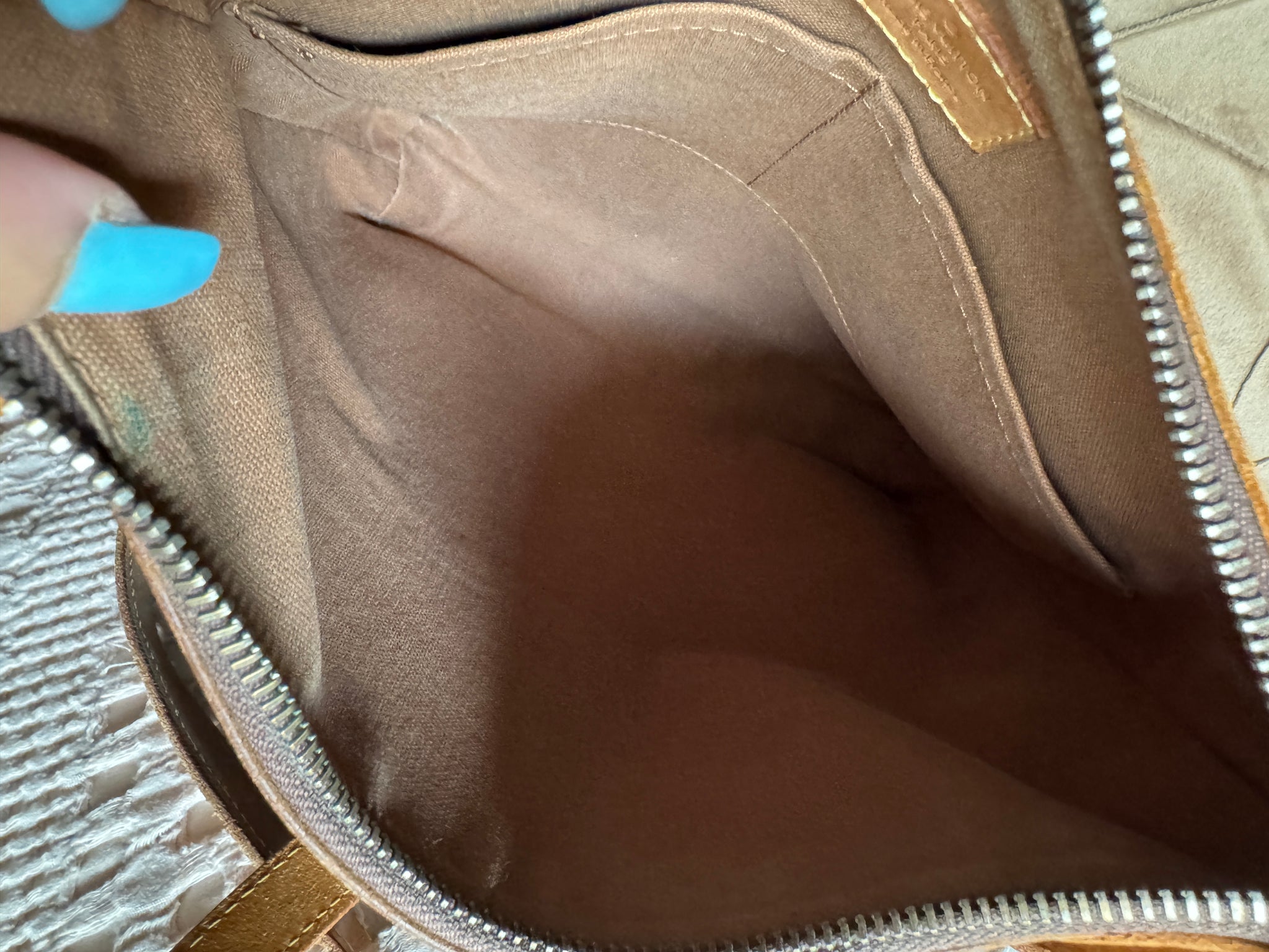 Authentic monogram Odeon PM in good condition. Vibrant canvas, medium dark patina. Strap is thick and adjustable. Interior is spacious and clean with two side pockets. Exterior has one large slip pocket. No peeling or stickiness. Vachetta has water marks, creases from